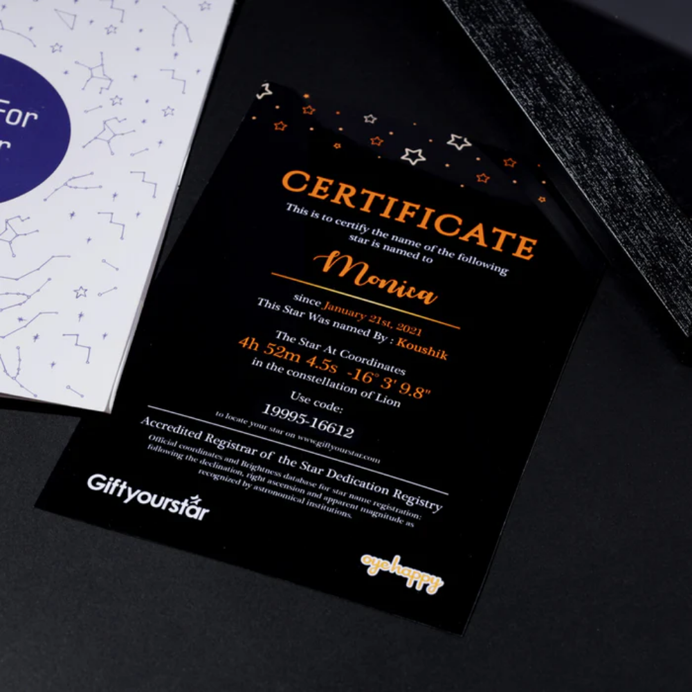 Printed on premium-quality material with elegant detailing, the frame highlights the star’s name, date, and coordinates—making it a stunning décor item for home or office. It’s a heartfelt way to celebrate love, achievements, or special memories.